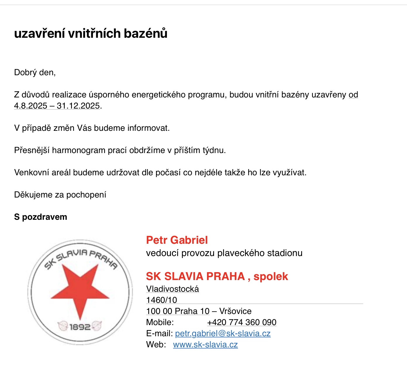 Proto Vás všechny moc prosím o spolupráci. Mějte u sebe vždy alespoň kopii své legitimace. Respektujte rozdělení šaten na pánské, dámské a společné dětské šatničky pro děti do 7 let.